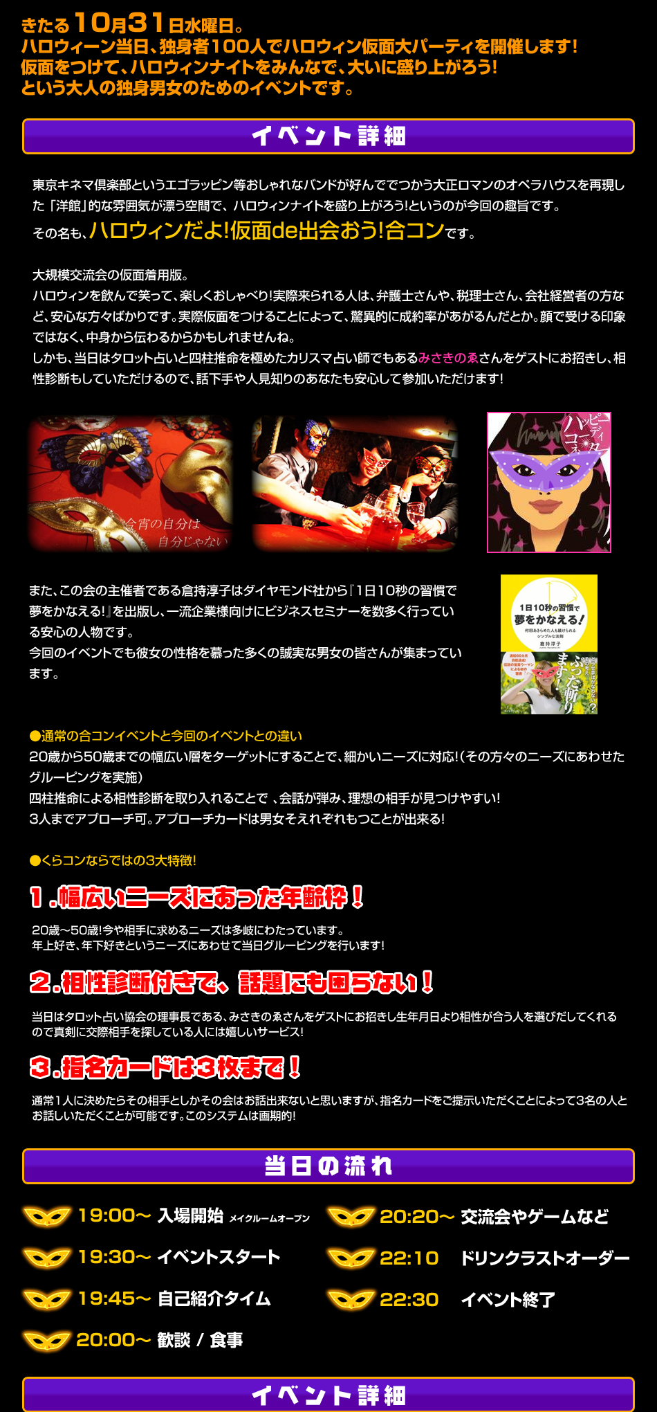 また、みさきのゑさんが、事前に生年月日から相性が良い人を見つけ出してくれて、その人と2階に上がることも可能です。こんなハラハラドキドキのイベント今までありましたか?一緒に仮面で素敵な夜を過ごしましょう。 |