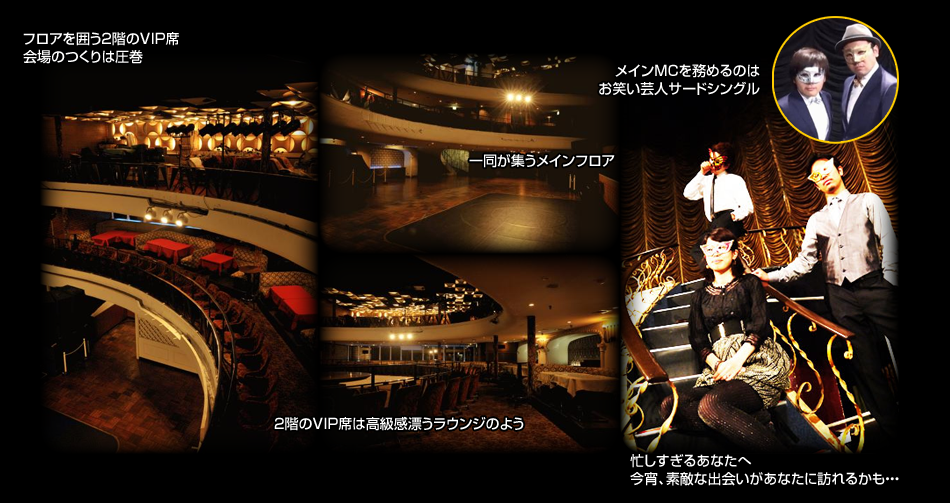 通常の交流会に参加者全員が仮面を着用するというルールを加えました。イベント中は原則仮面を外すことができません。しかし、2階のVIP席でのみ、【仮面を外すことができます。】2階へのVIP席へは「VIPカード」が無いと上がることができません。さらに、「VIPカード」は1人3枚配布しますが、気になった異性とペアにならねばカードを行使することができません。お気に入りの異性の方に「一緒にVIP席に行きましょう」と声をかけ、それが受理されれば2階のVIP席に上がり、仮面の下の本当の姿を見ることができるのです。
